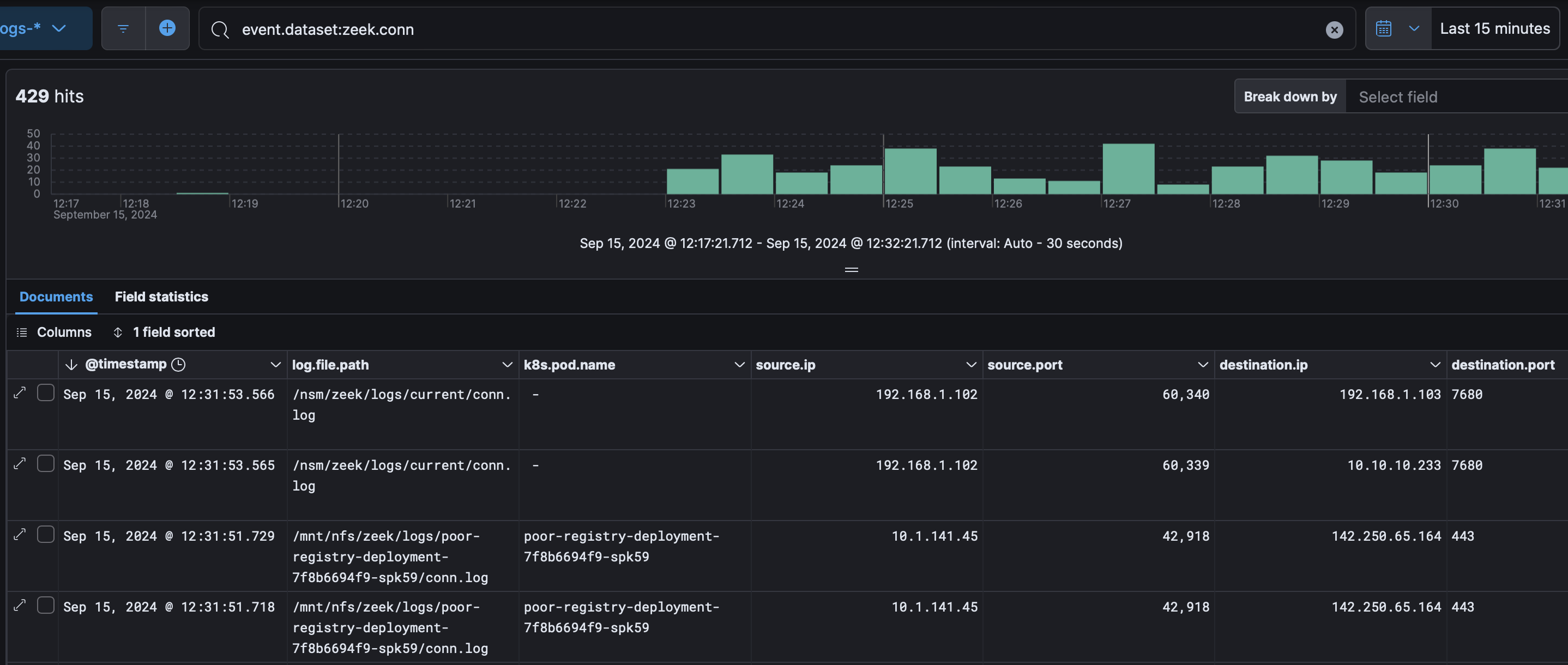 I added a Zeek sidecar by modifying scenario/<scenario>/deployment.yaml from the KG Github files. This will mount the NFS share, create a directory with the pod’s name, then start sniffing on eth0, outputting in JSON format to the pod name directory. This lets me store the logs on my NAS, saving Kubernetes cluster disk space.